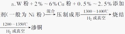 熔滲法分為高溫?zé)Y(jié)鎢骨架后滲銅和低溫?zé)Y(jié)部分混和粉后滲銅兩種方法。